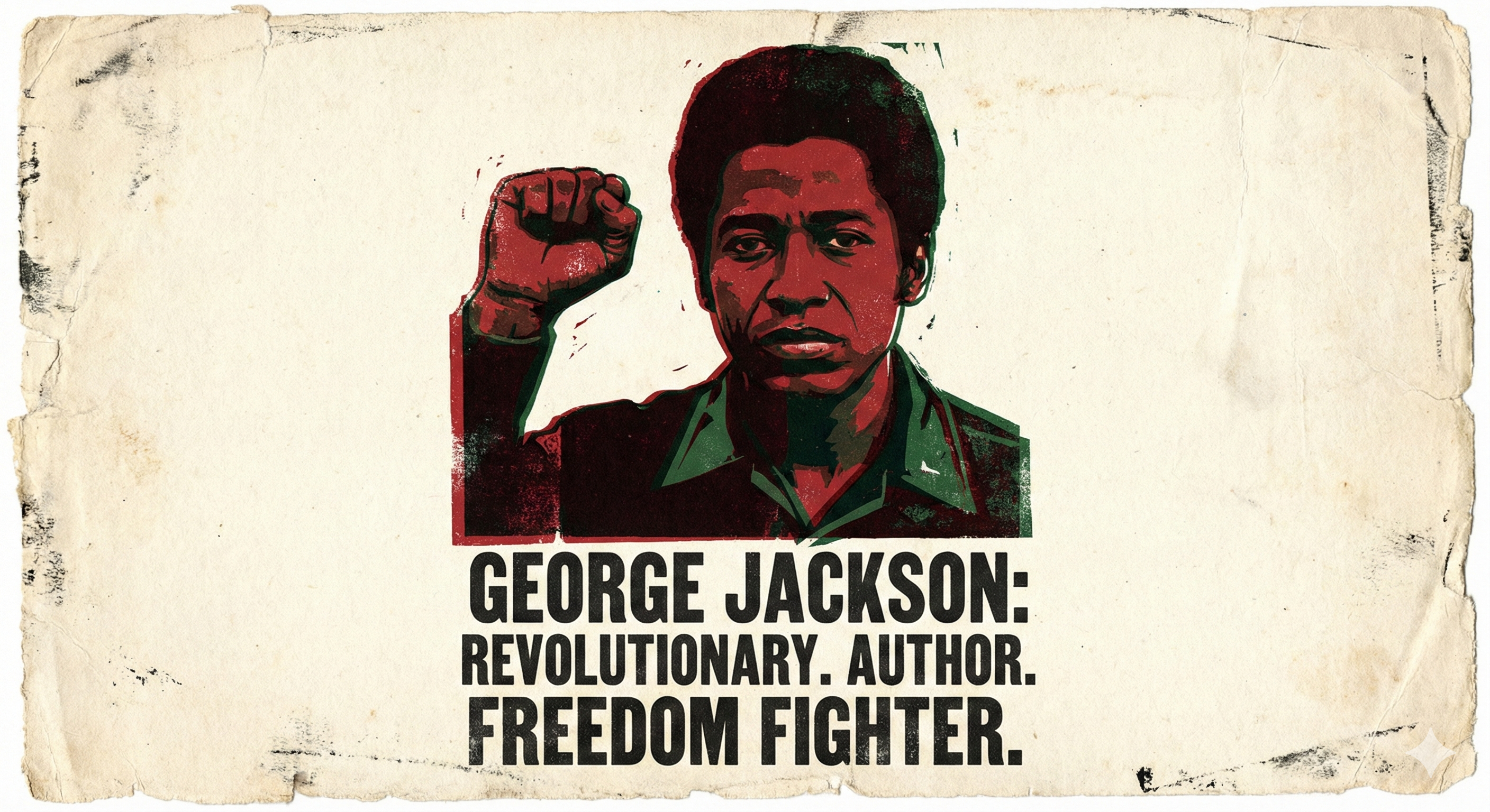 A bold, red, black, and green graphic illustration designed like a vintage 1970s protest poster. It features a stylized portrait of George Jackson with a serious expression and a raised fist, symbolizing the Black Power movement. Large, distressed text at the bottom reads, “GEORGE JACKSON: REVOLUTIONARY. AUTHOR. FREEDOM FIGHTER.