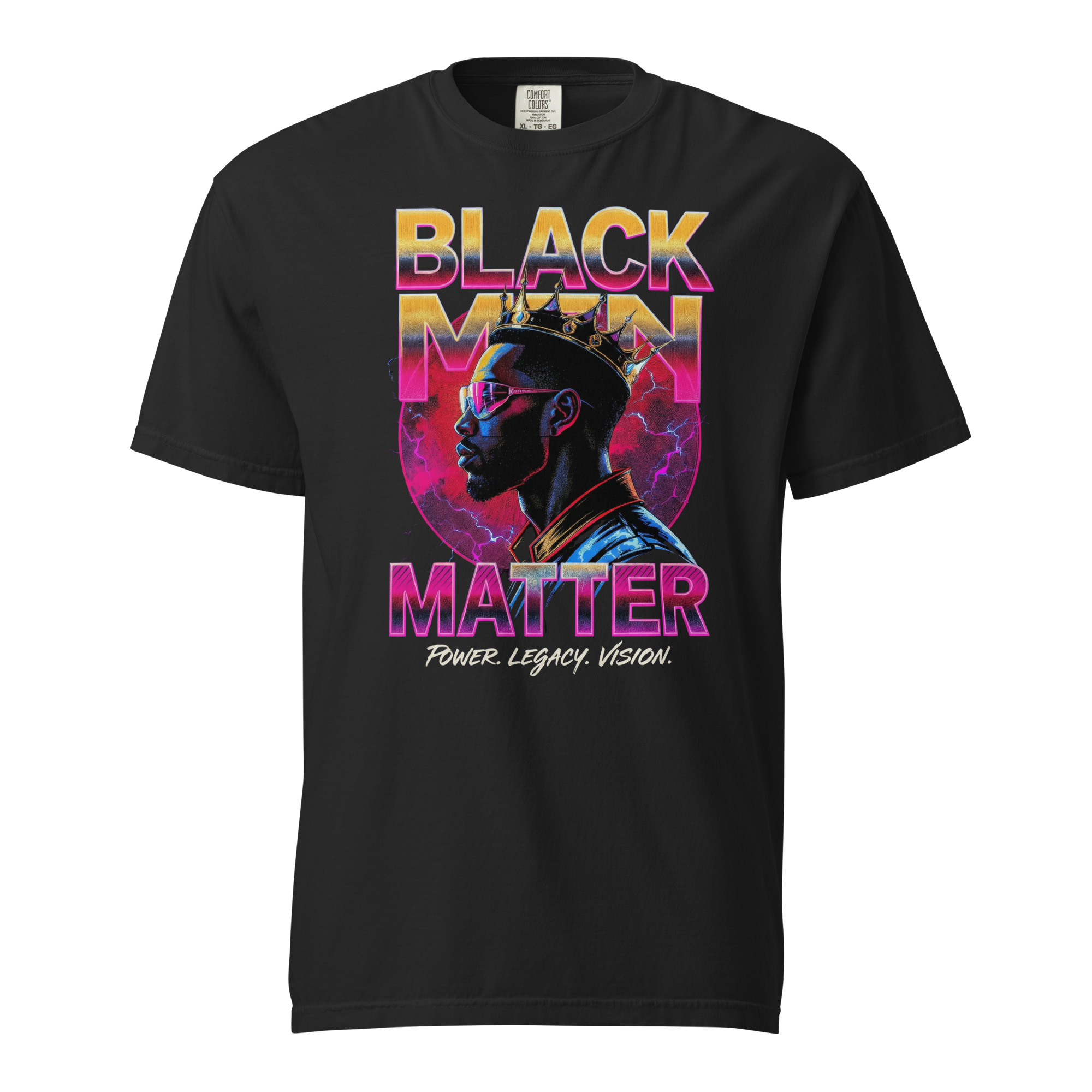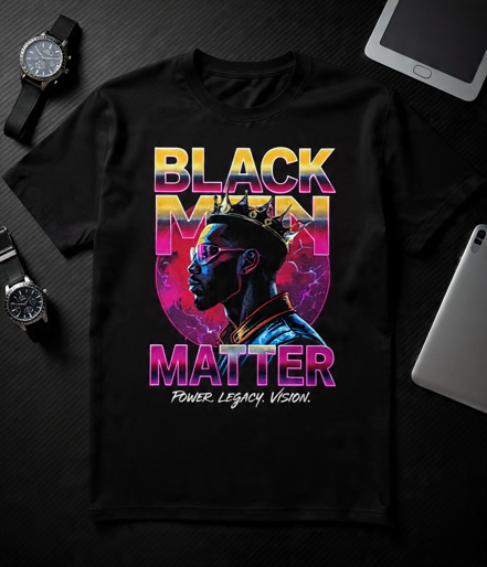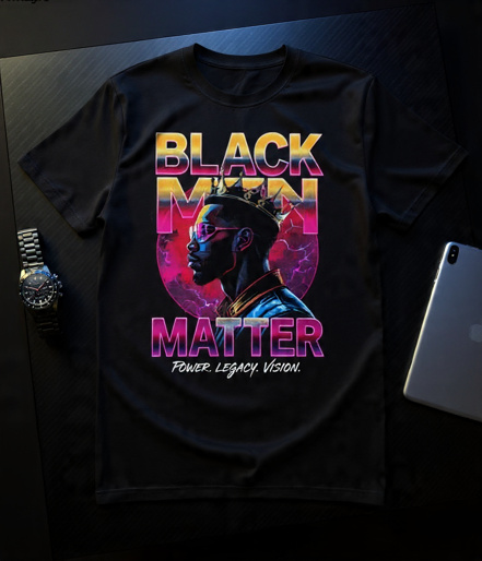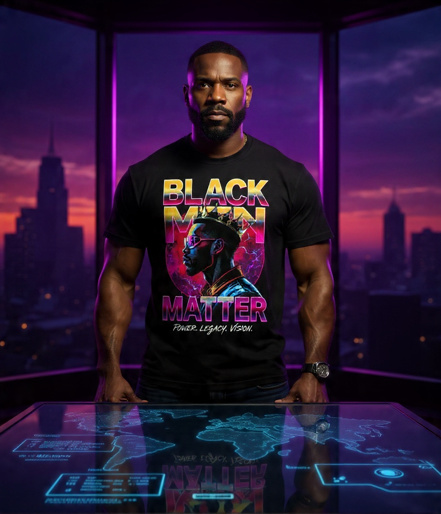 Neon Dominance: A vibrant sunset-inspired gradient of gold, magenta, and electric blue surges behind the “BLACK MEN MATTER” typography, set against a deep obsidian base.